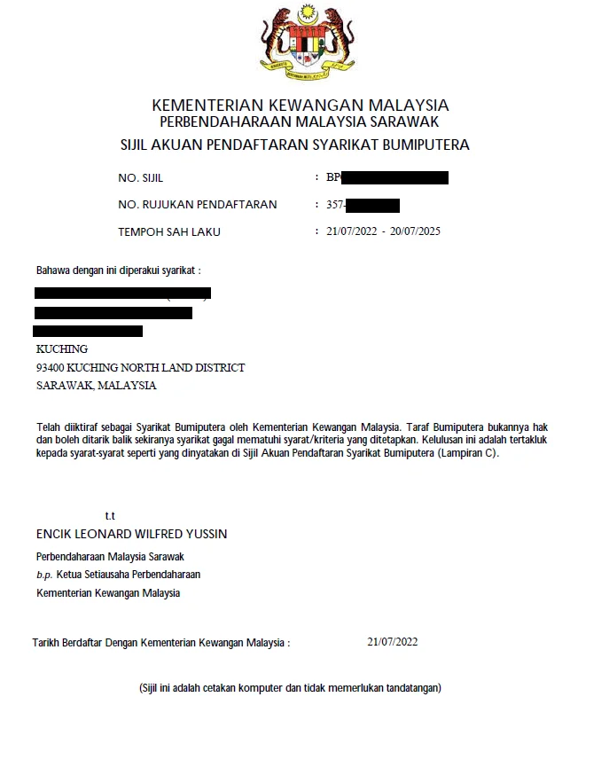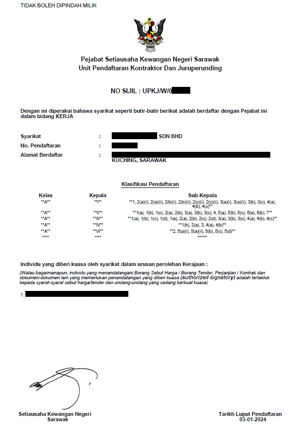 The MOF certificate is for companies that are registered to participate in tenders throughout Malaysia and are led by the Federal Government. While the UPKJ certificate is for companies to participate in tenders in Sarawak and is led by the Sarawak State Government.